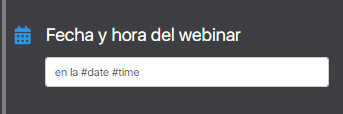 En el Mezclador de seminarios web, en la configuración del bloque «Fecha y hora del seminario web», puede especificar las variables #fecha y #hora; esta es la fecha y hora de inicio del seminario web, los valores se sustituyen desde la configuración del seminario web.