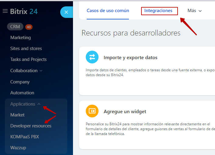 Para editar los datos del webhook previamente creado en el lado de Bitrix 24 vaya a la sección Desarrolladores – Integraciones.