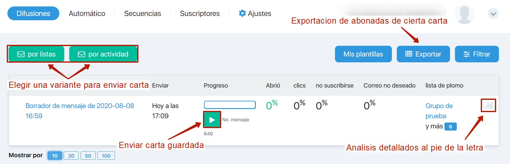 - Envío por actividad – el mensaje se enviará a los suscriptores de acuerdo con los criterios de actividad de las cartas anteriores: abierto / no abrió el correo electrónico / hizo clic / no hizo clic en el enlace de la carta anterior, etc. Para enviar dicho mensaje, use el botón Por actividad.