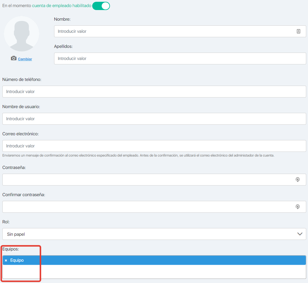 2. En el perfil de usuario. El campo correspondiente muestra todos los equipos a los que está asignado el usuario. Al hacer clic en la cruz de este campo, eliminará al usuario del equipo. Si hace clic en el campo blanco, podrá agregar un usuario al equipo.