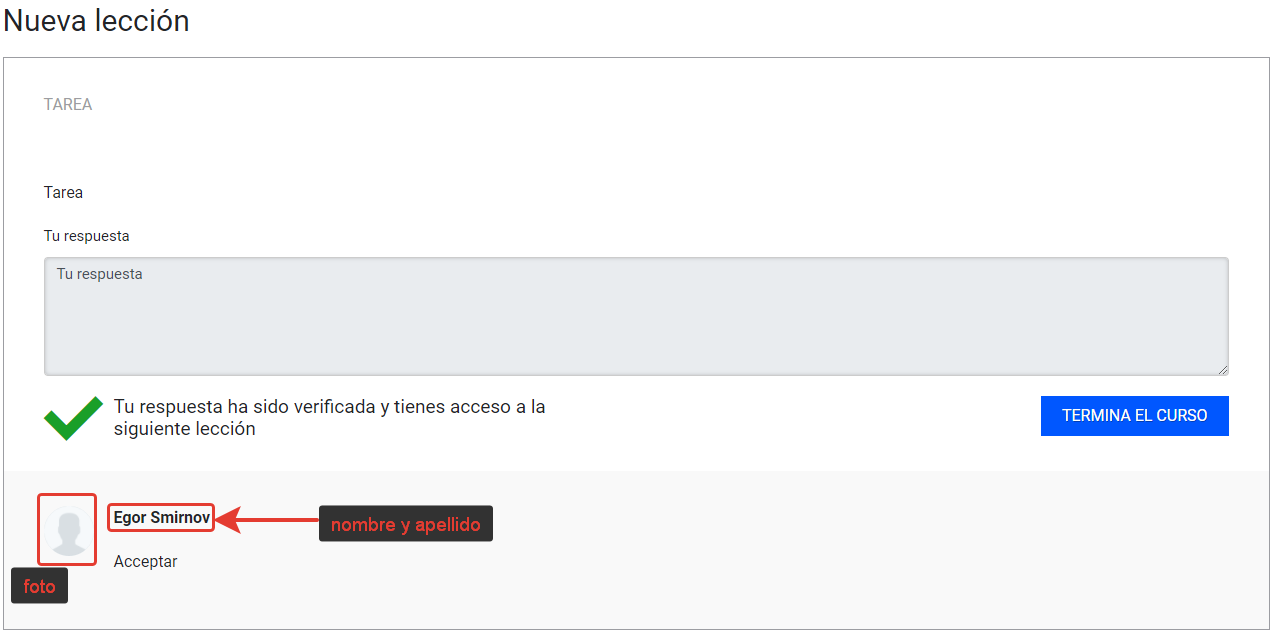 El informe utilizará el nombre, el apellido y el conjunto de fotos en el perfil del usuario. Después de que se haya agregado la respuesta al informe, se enviará al cliente por correo y se agregará en la lección debajo del informe del cliente: