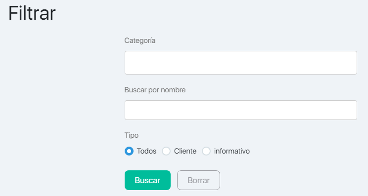 No es necesario completar todos los campos del filtrar. Debe especificar los valores del filtrar y hacer clic en el botón Buscar. Las listas correspondientes a las condiciones de filtrado se mostrarán en la tabla. Para mostrar una tabla completa, haga clic en el botón Filtrar y luego en Borrar.