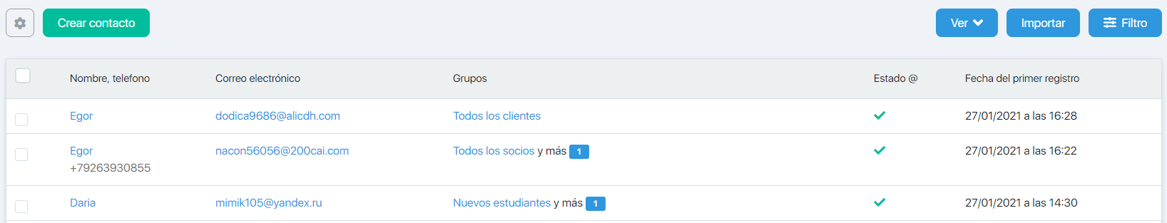 Al hacer clic en el grupo al que pertenece el contacto, se abre el formulario Suscriptores, con la selección de todos los suscriptores de este grupo.